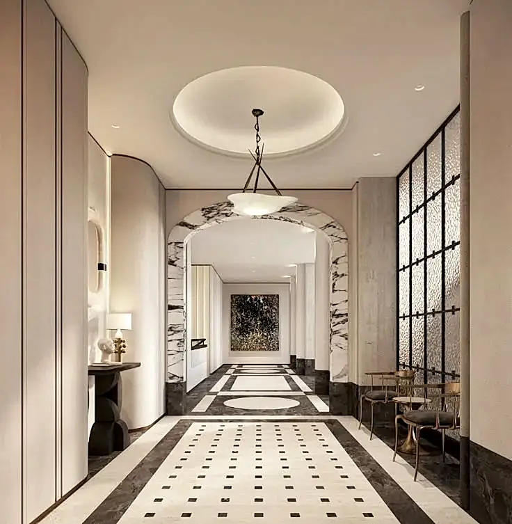 In long, narrow corridors, apply borders along both sides to create guiding lines. This makes the space appear longer and defines the walking path.