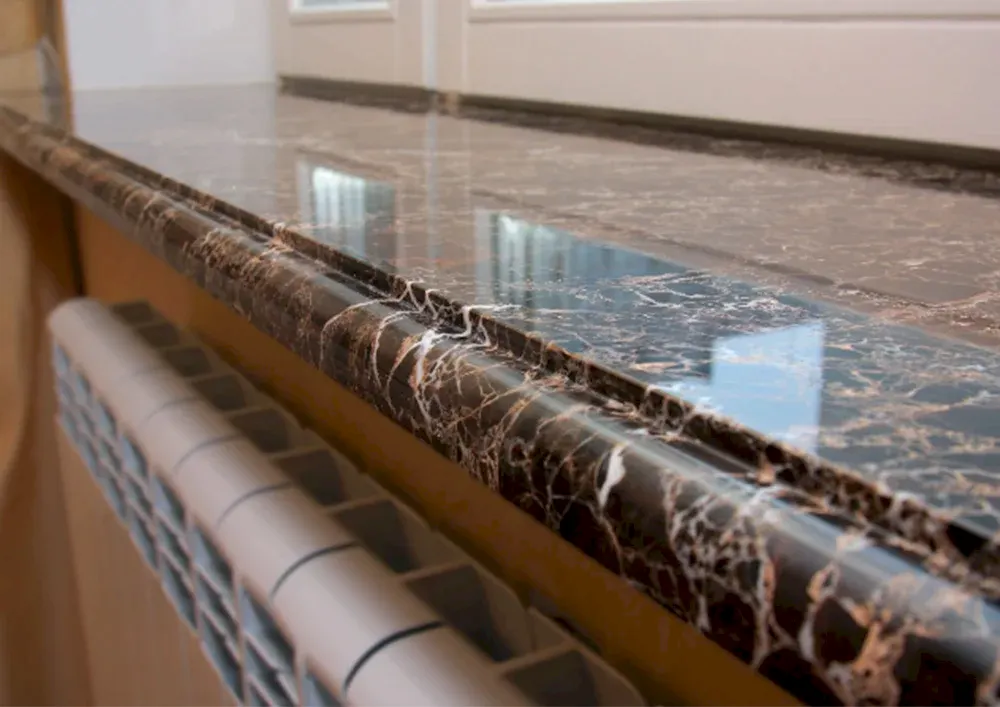 Precise dimensions of the window opening are taken, and the marble is cut to fit. For exterior sills, a 2–3 cm overhang is usually added on both sides.